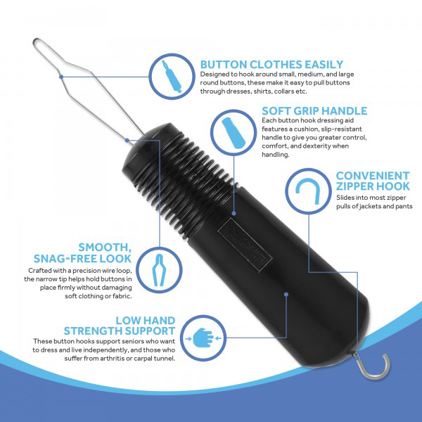 - Soft Grip Handle – Each button hook dressing aid features a cushion, slip-resistant handle to give you greater control, comfort, and dexterity when handling.